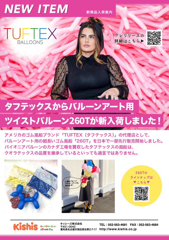 【新商品!】タフテックスからバルーンアート用ツイストバルーン260Tが新入荷しました! 2024年11月22日 投稿者: kishisnews カテゴリー: 商品情報Bookmark the permalink
