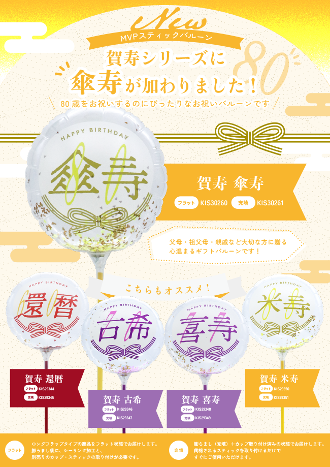 【新商品!】MVPスティックバルーン賀寿シリーズに傘寿が加わりました!