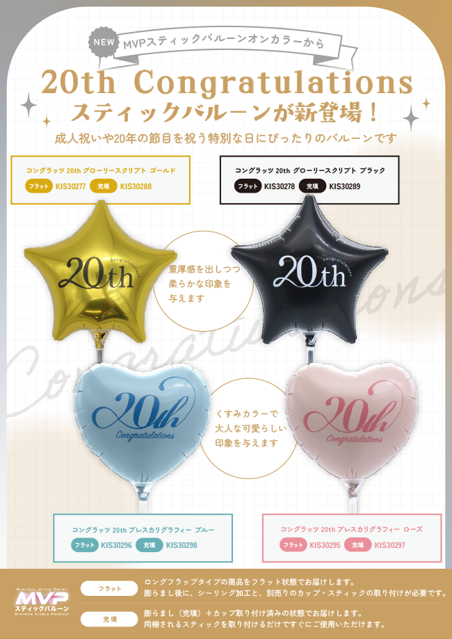 【新商品!】MVPスティックバルーンオンカラーから成人祝いや20年の節目に使える「20th コングラッツレーションズ」バルーンが新登場! 2025年9月24日 投稿者: kishisnews カテゴリー: 商品情報Bookmark the permalink